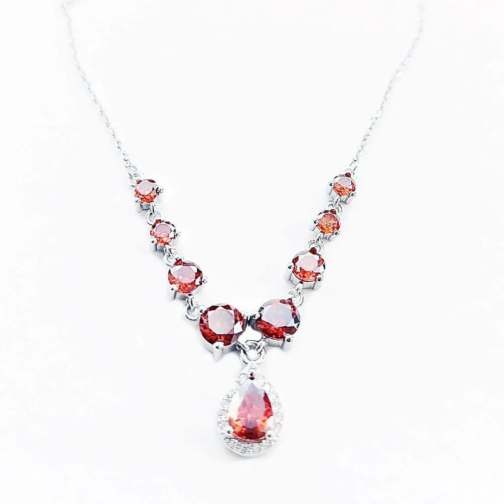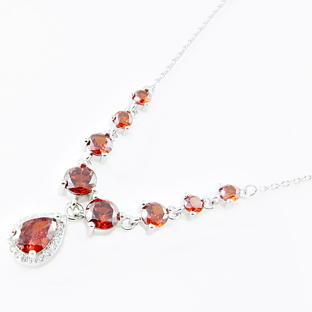 Ślubny damski naszyjnik srebrny z bordowymi cyrkoniami. Subtelny wzór biżuterii ze srebra, rodowany. Długość naszyjnika regulowana 42- 44 cm, cyrkonie zakuwane, waga 4,3 g. Szerokość największego kamienia, elementu - łezki 0,6 cm, długość 0,7 cm. Elegancki i subtelny wzór biżuterii, doskonały na co dzień i na okazje, odpowiedni na wyjątkowy prezent