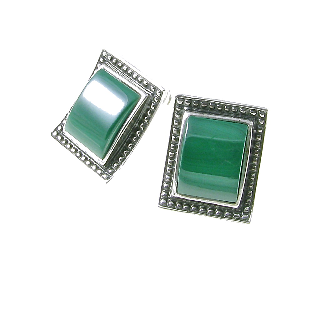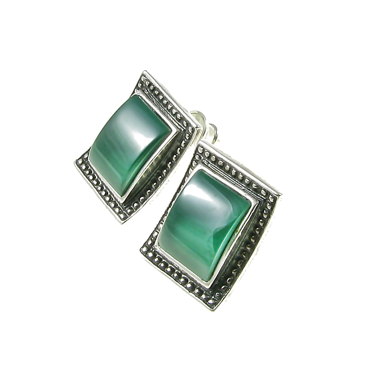 Kolczyki srebrne z malachitem w stylizowanej srebrnej oprawie, wykonane w całości ze srebra próba 925, oksydowane. Długość 1,6 cm, szerokość 1,4 cm, waga 5,7 g. Ciekawa oprawa kolczyków i piękna barwa zielonego malachitu doskonale pasują na co dzień i na okazje.
