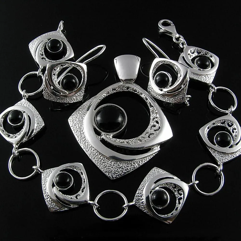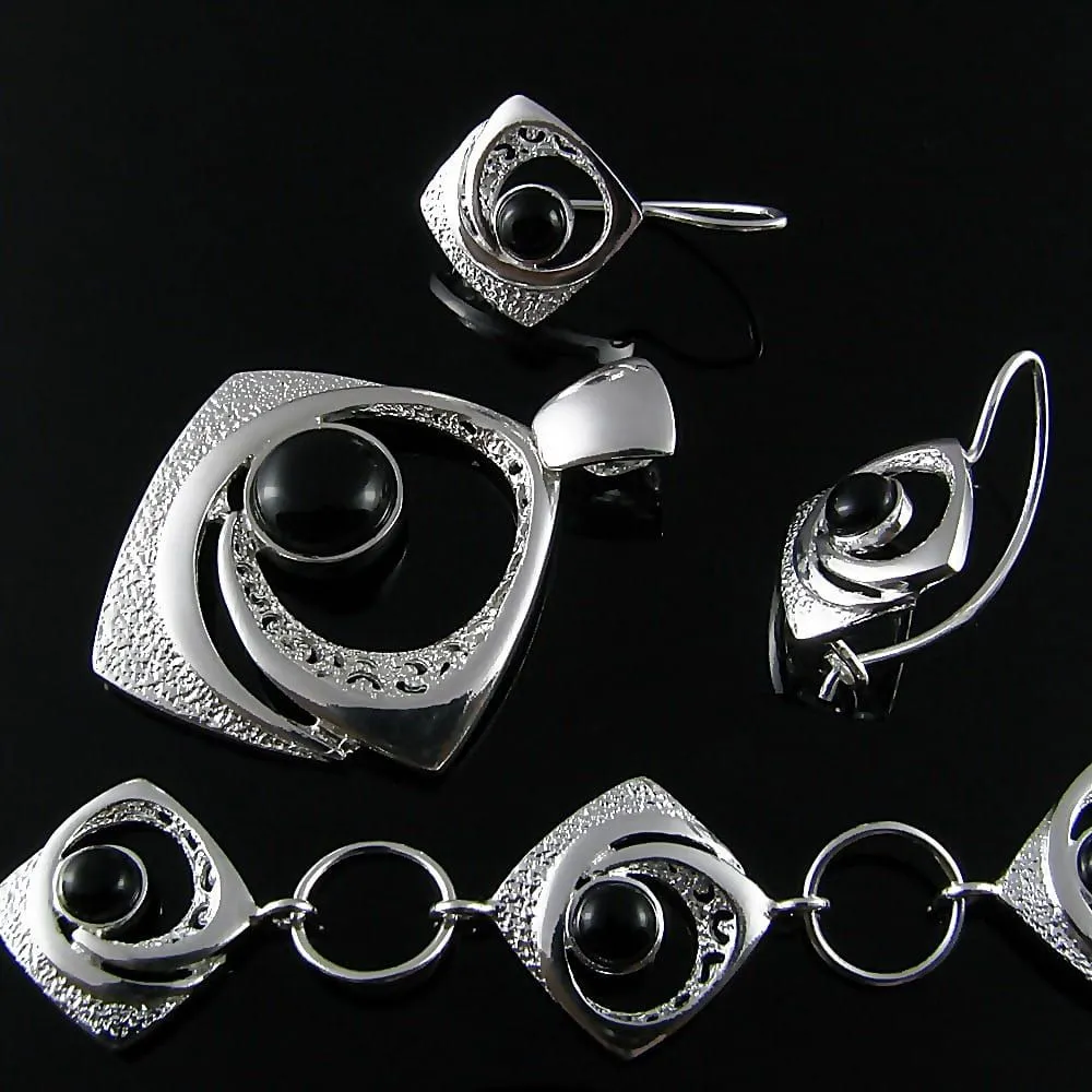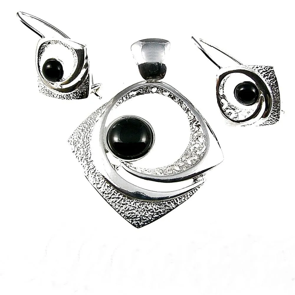 Elegancki srebrny komplet z kamieniami - onyksami w ciekawej srebrnej oprawie, kolczyki, duży wisiorek, Wykonany w całości ze srebra próby 925 przez polskiego producenta. Duży wisiorek o wymiarach 3,6 x 3,6 cm + uchwyt, pięknie komponuje się z wiszącymi kolczykami. Niepowtarzalny wzór biżuterii doskonałej na wyjątkowy prezent.