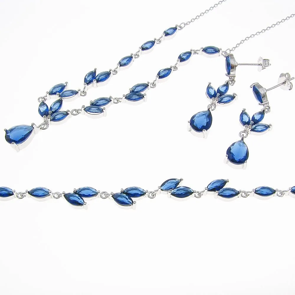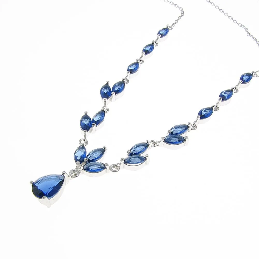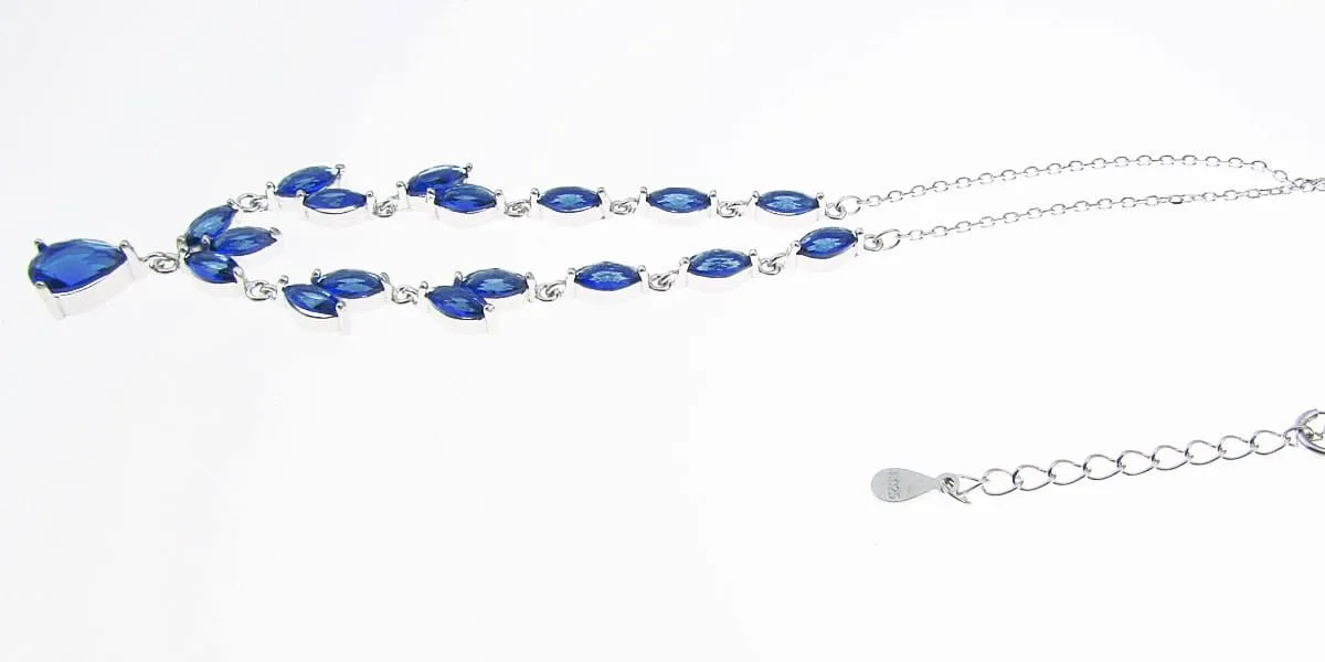 Wyjątkowy damski naszyjnik srebrny z szafirkami. Niezwykle subtelny wzór biżuterii ze srebra, rodowany. Długość naszyjnika regulowana 42- 45 cm, szafirki zakuwane, waga 5,7 g. Szerokość największego kamienia, elementu - łezki 0,6 cm, długość 0,7 cm. Elegancki i subtelny wzór biżuterii, doskonały na wyjątkowy prezent