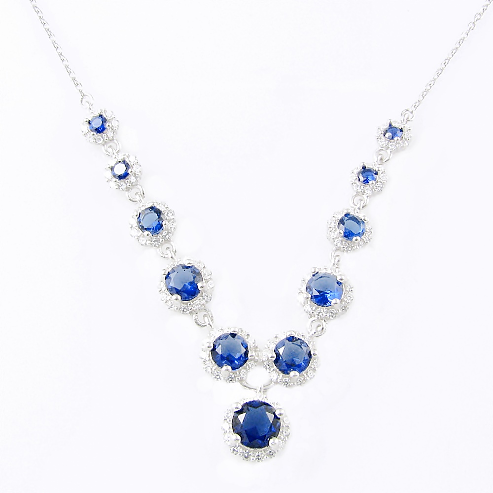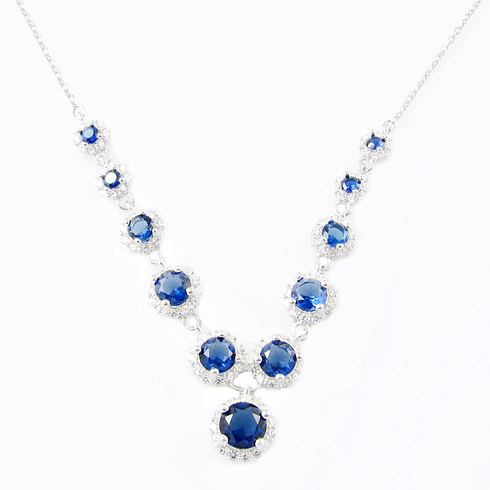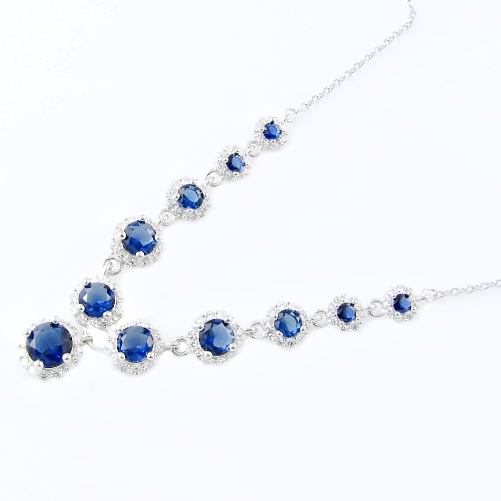 Wyjątkowy damski naszyjnik srebrny z szafirkami, wysadzany białymi cyrkoniami.