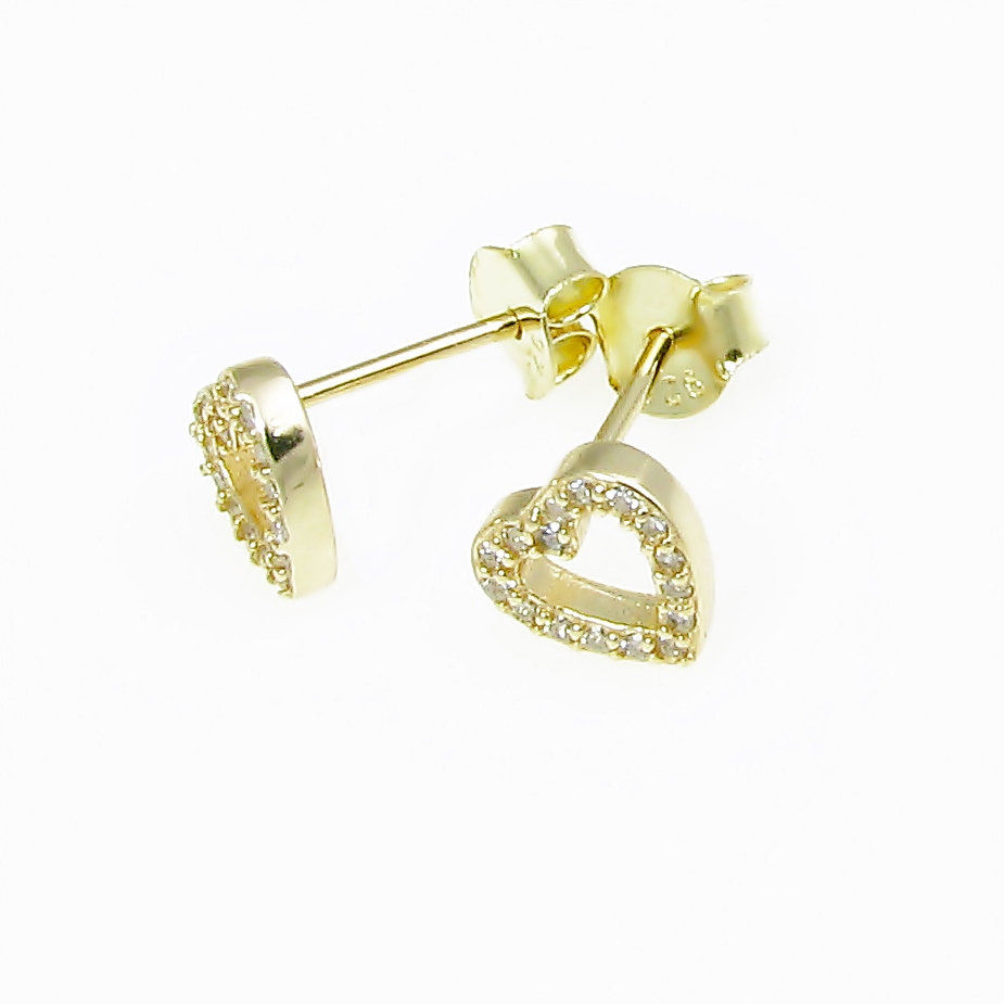Odkryj urok pozłacanych srebrnych kolczyków w kształcie serduszek, wysadzanych błyszczącymi białymi kryształkami. Te delikatne dodatki wykonane są ze srebra próby 925 i pokryte cienką warstwą złota, co nadaje im wyjątkowy blask i trwałość.