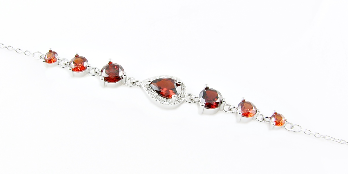 Elegancka ślubna srebrna bransoletka z bordowymi cyrkoniami i białymi kryształkami, idealna na wszelkie okazje i na co dzień, doskonała do wszelkich kreacji. Wykonana w całości ze srebra, rodowana. Długość bransoletki 17 cm + łańcuszek do regulacji 3 cm, szerokość największego ogniwka 6 mm, waga 3,8 g. Wyjątkowa srebrna bransoletka doskonała na niepowtarzalny prezent dla modnej i eleganckiej kobiety.