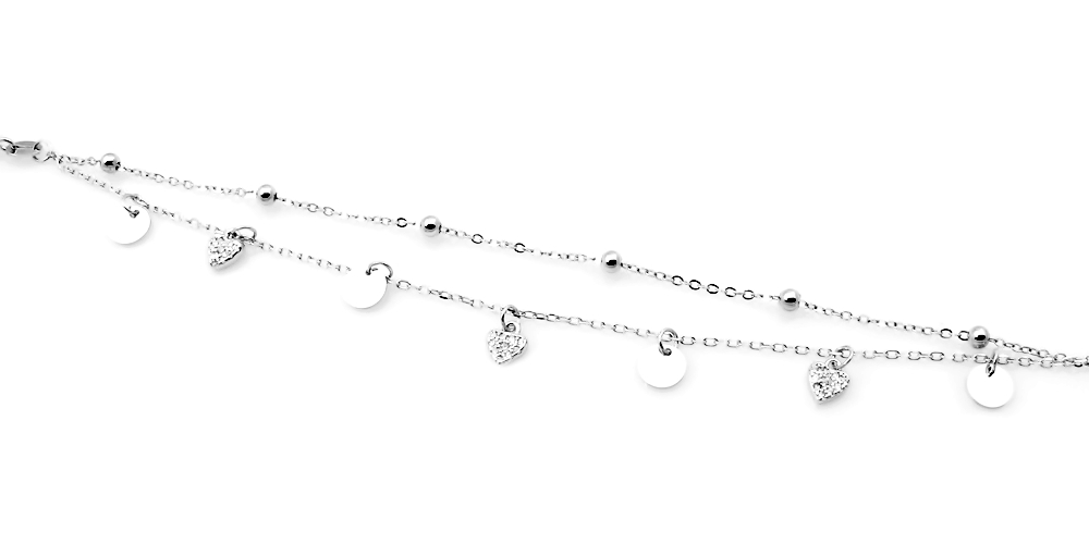 Modna srebrna bransoletka z zawieszkami rodowana, idealna na wszelkie okazje i na co dzień. Wykonana w całości ze srebra, rodowana, elementy wysadzane kryształkami. Długość bransoletki 17 cm + łańcuszek do regulacji 3 cm, wga 3,5 g. Świetny wzór modnej biżuterii ze srebra idealny na niepowtarzalny prezent.