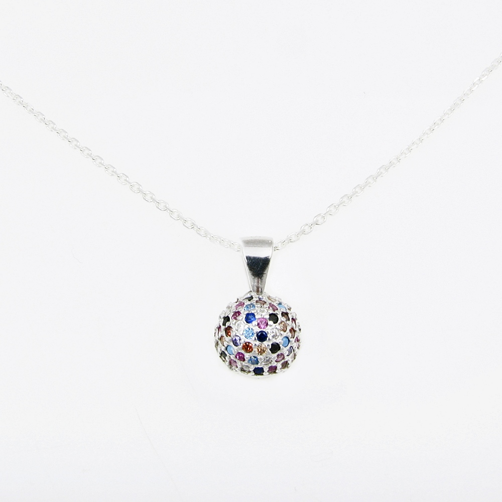 Kolorowa srebrna kuleczka wysadzana kryształkami na łańcuszku.