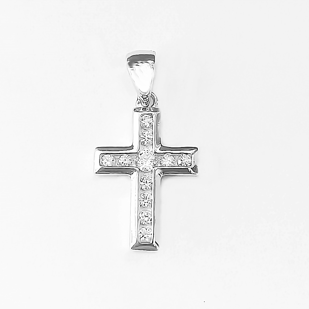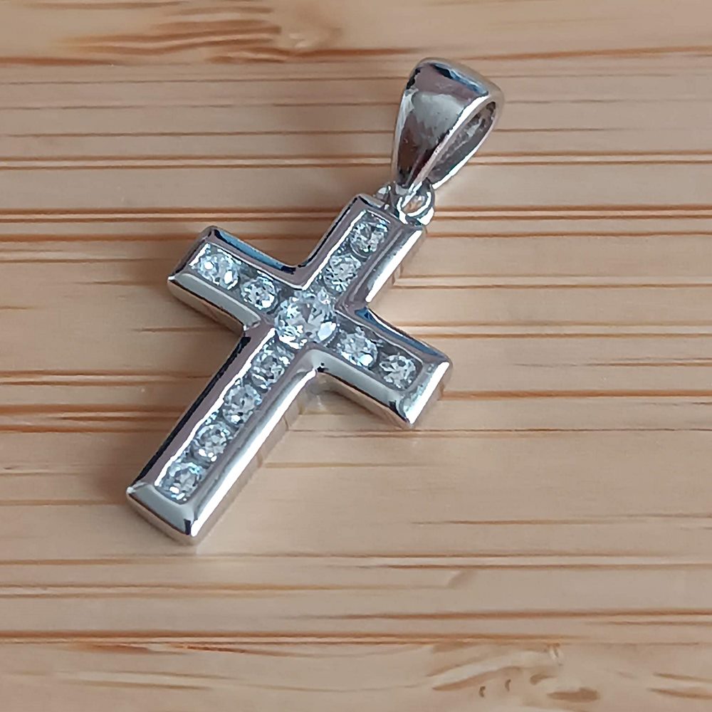 Nieduży wisiorek krzyżyk srebrny wysadzany białymi cyrkoniami, rodowane srebro próby 925 . Długość 1,7 cm uszko x 1,2 cm. Wykonany w całości ze srebra próby 925, rodowane srebro . Błyszczący i subtelny. Polecamy łańcuszki dostępne w naszym sklepie w kategorii łańcuszki srebrne.